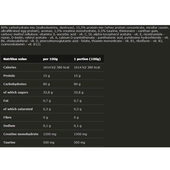 Отлично подходит для людей, которым проблемно набрать вес. Гейнер компании Olimp хранит в себе главные вещества, для развития взрывной силы и увеличения мышечной массы. Комплекс углеводов этого гейнера, составлен из разных гликимических индексов, в его составе хранятся различные виды белка, в том числе,концентрат сыворотки, яичный и казеиновый белок, а так же содержится два энергетических элемента:креатин и таурин.