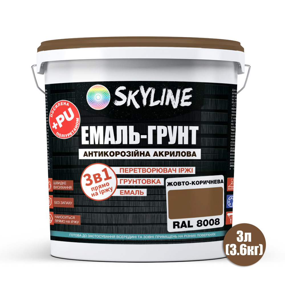 Антикорозійна акрилова +PU (посилена поліуретаном) водорозчинна шовковисто-матова емаль 3в1 Skyline для використання зовні та всередині приміщень. Поєднує властивості одночасно трьох матеріалів: