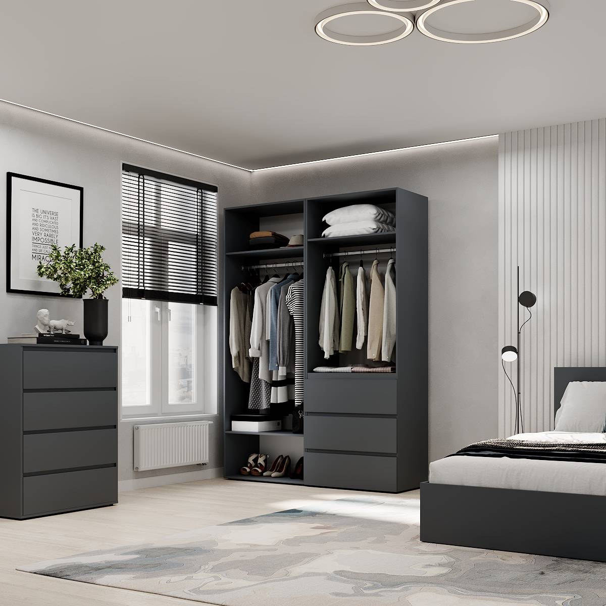 Розпашна шафа Light стане ідеальним вибором для тих, хто хоче підтримувати порядок і приховати свої речі, не порушуючи стиль інтер’єру.
