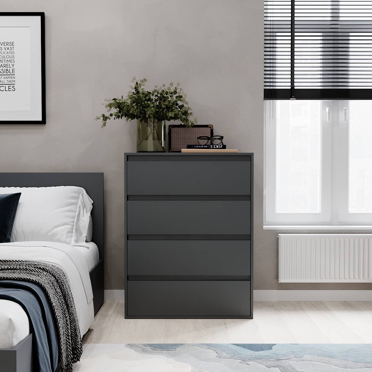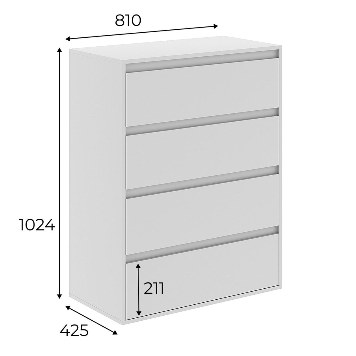 Високий комод з 4 висувними шухлядами – відмінне рішення для спальні, що дозволяє організувати зберігання необхідних речей: постільної білизни, рушників, піжам, халатів, домашнього одягу тощо. Проте, Комод Light 4 досить компактний і не займає багато місця, що є суттєвою перевагою там, де немає можливості розмістити великогабаритні меблі для спальні. Ще одні плюс моделі – сучасний дизайн, витриманий в дусі універсальності й лаконізму, який припаде до душі поціновувачам лофту, мінімалізму, скандинавського та інших актуальних інтер’єрних напрямків. Переваги комода Light 4: оптимальний розмір для кімнат будь-якої площі; зручна продумана конструкція; міцний і довговічний корпус, розрахований на постійні навантаження; 4 містких висувних шухляди; зносостійка фурнітура прихованого монтажу;