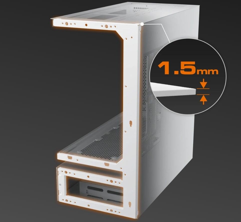 Сталева рама товщиною 1.5 мм підсилює шасі, зберігаючи структурну цілісність навіть при використанні підвісної центральної вентиляції. В результаті виходить смілива, відкрита архітектура, яка залишається жорсткою, надійною і готовою до високопродуктивних збірок.