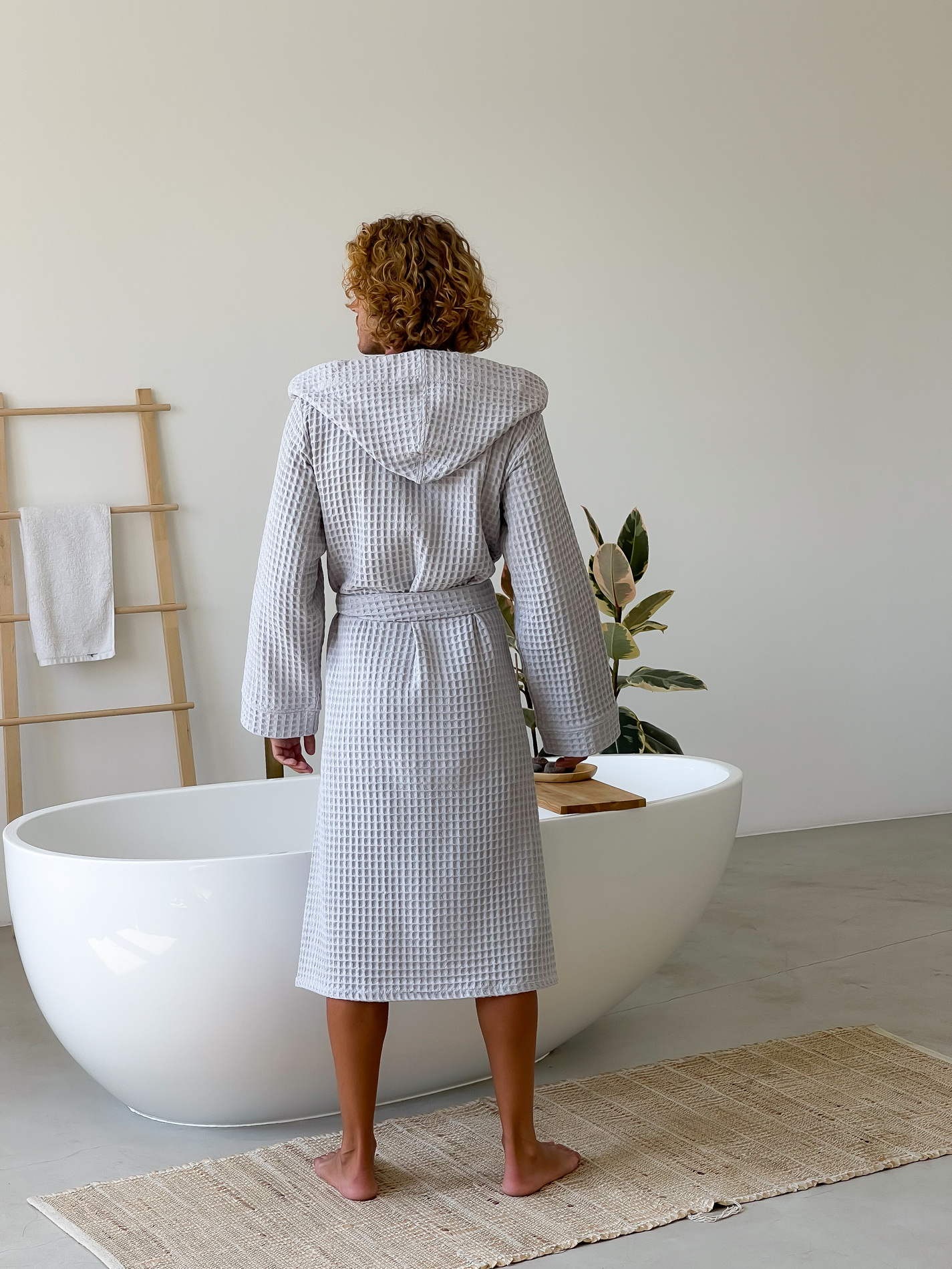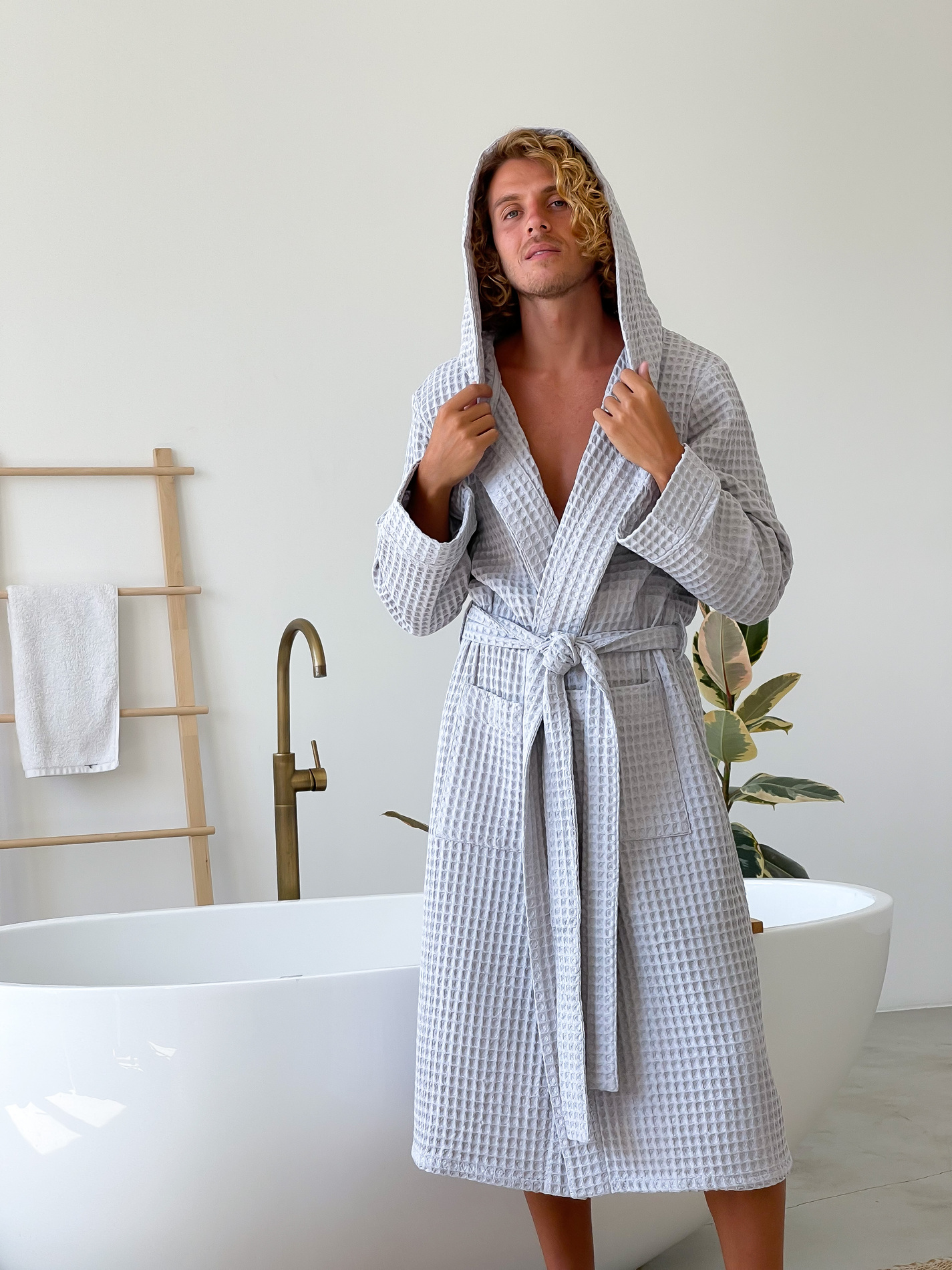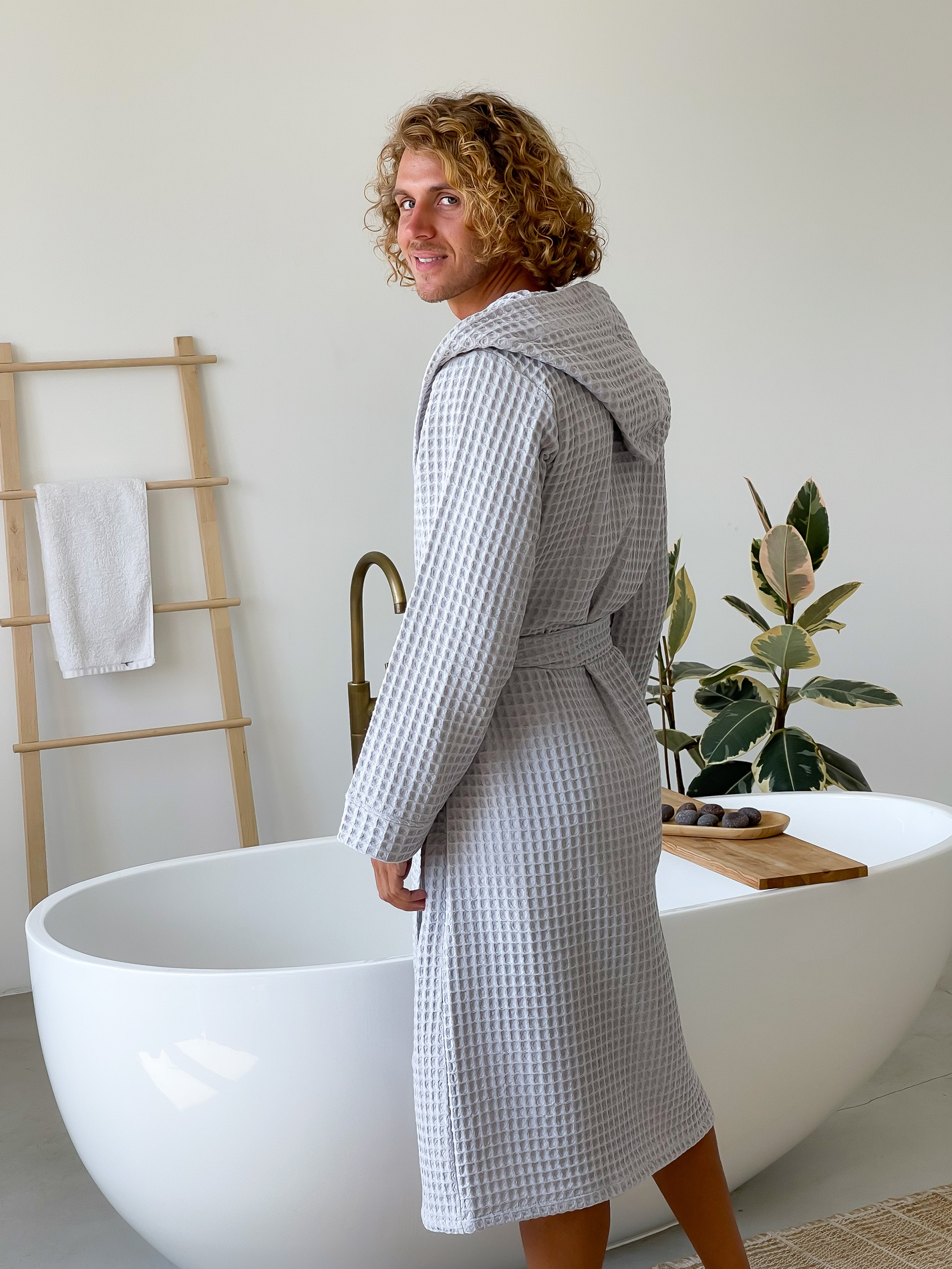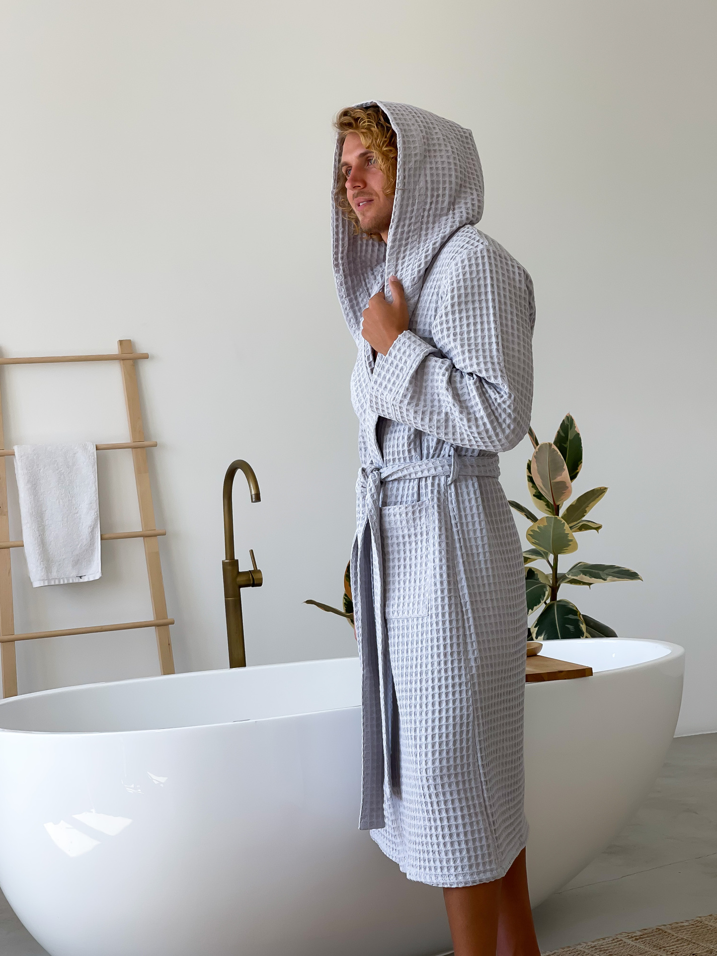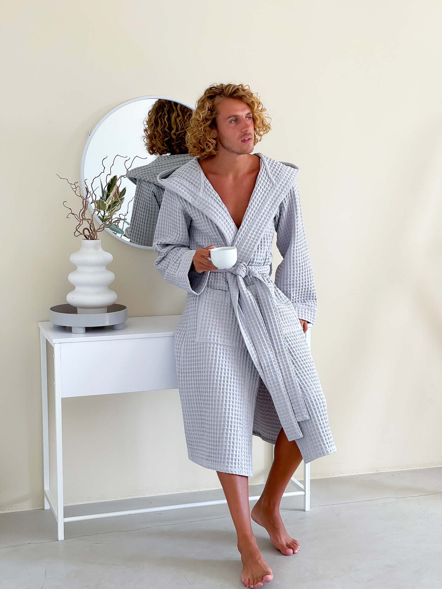 Чоловічий вафельний халат. Тканина велика «грецька вафелька» Стильний банний халат з капюшоном приємний до тіла і добре вбирає воду, його дуже приємно вдягнути після лазні або душу. Ідеальний для прохолодної пори року. Щільна та натуральна тканина допоможе швидко зігрітися. Тканина добре "дихає" і не створює парникового ефекту. колір: світло-сірий Тканина: 100% бавовна, Туреччина (тканина не декатована, після прання дає усадку 6-7%) Щільність: 300 г/м2 розміри: s, m, l, xl, 2xl Розміри відповідності: S-46-48, М-48-50, L-50-52, XL-54-56 2XL-56-58