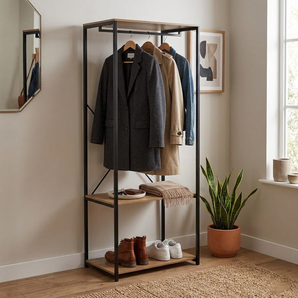 Забудьте о громоздких шкафах и беспорядке. Эта напольная гардеробная система разработана для тех, кто ценит свободу пространства и визуальную легкость. Благодаря сочетанию премиальных материалов и выверенных линий, вешалка становится полноценным элементом декора, гармонично дополняя как строгий офисный стиль, так и уютную домашнюю атмосферу спальни или прихожей.
