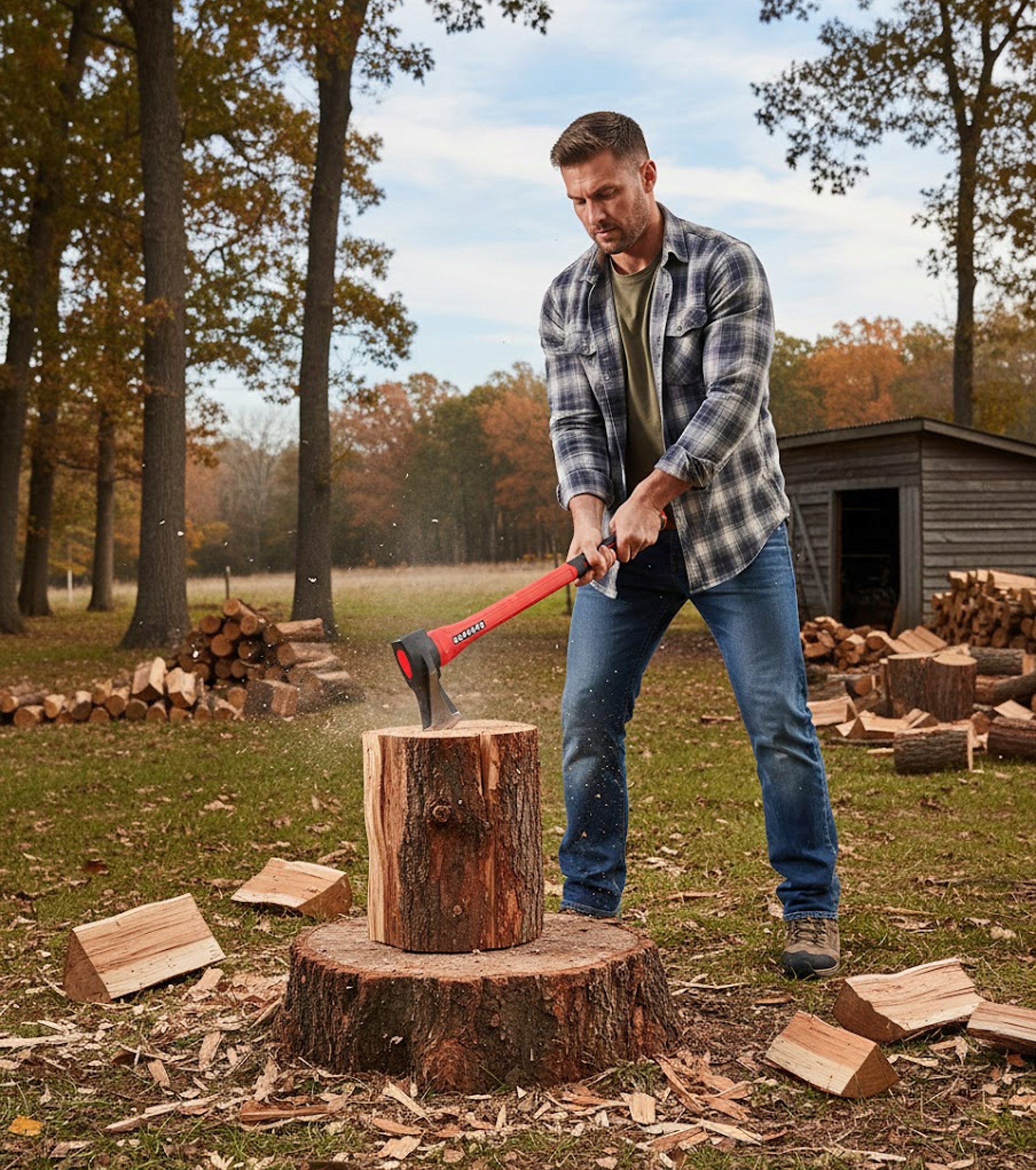 ✔️ Клинообразная форма: Специальная форма головки раскалывает древесину, а не режет її . Это значительно уменьшает риск застревания топора в сучковатом пне.