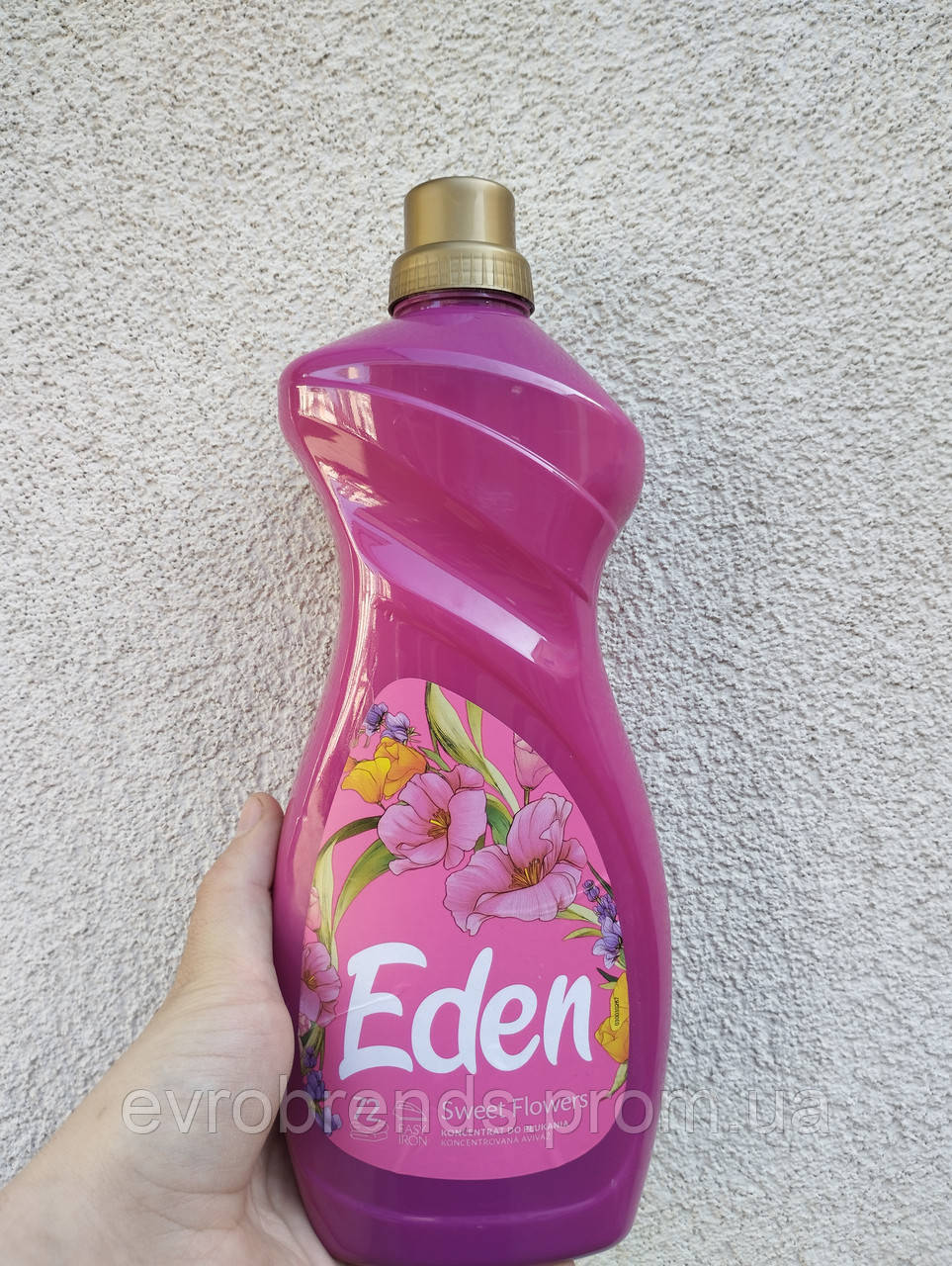 Концентрированный ополаскиватель Eden Sweet Flowers 1.8 л – до 72 стирок. Придает белью мягкость, антистатический эффект и стойкий цветочный аромат до 140 дней.