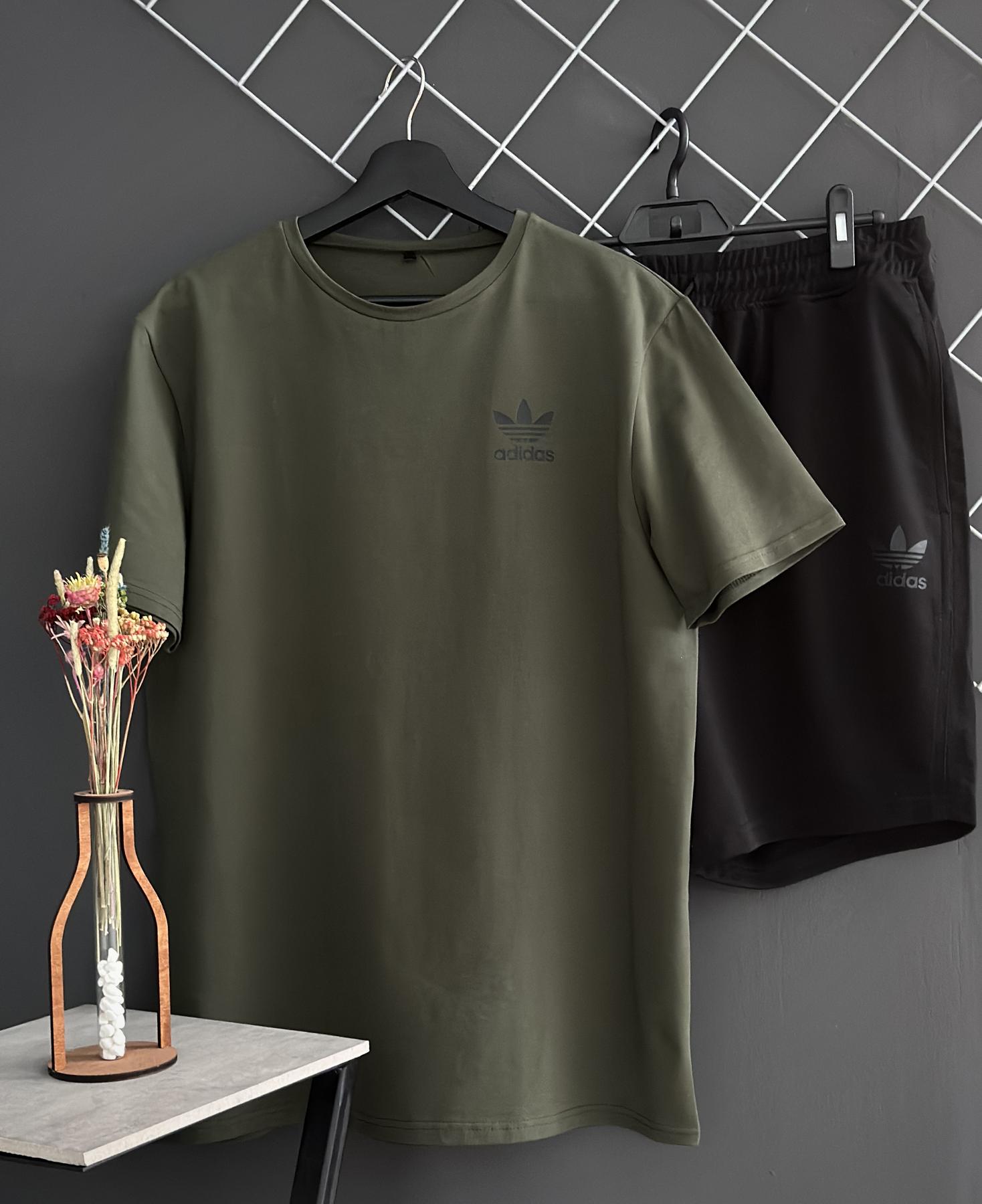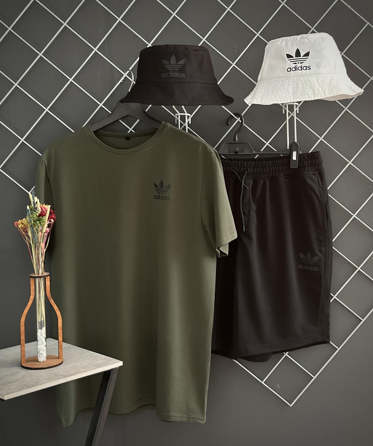 Комплект состоит из черных шорт Adidas, футболки хаки и панамы, что делает его идеальным решением для летних прогулок, пикников, спортивных мероприятий или просто отдыха на природе. Шорты изготовлены из двунити, что обеспечивает легкость и комфорт в жаркую погоду, а регулируемый пояс на шнурке позволяет подстроить их под вашу фигуру.