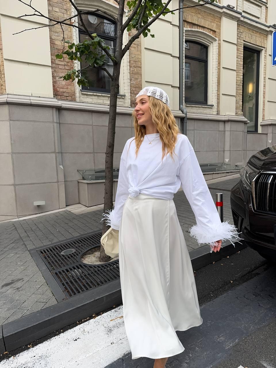 Женская кофта лонг белый с перьями декоративными оверсайзами.