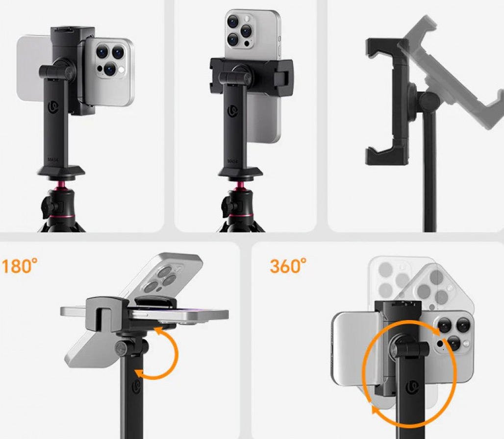 Модель поддерживает регулировку наклона до 180°, позволяя легко подобрать оптимальный ракурс. Это удобно для вертикальной и горизонтальной съёмки. Держатель помогает точно настроить положение смартфона под любые задачи. Управление остаётся простым и интуитивным.