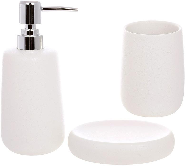 Набор керамических аксессуаров Bright Bath "White" для ванной комнаты. Стильный и функциональный набор аксессуаров для ванной комнаты, кухни или туалета. Цвет керамики: белый матовый. Классические формы аксессуаров для ванной комнаты. В комплекте 3 предмета:- дозатор для жидкого мыла или лосьона 400мл (Ø7.5см, высота - 17.5см), пластиковая механическая крышка-дозатор;- овальная мыльница 12.5х9х3см;- стакан-подставка для зубных щеток 400мл (Ø7.5см, высота - 10см).Набор аксессуров Bright Bath для ванной комнаты упакован в картонную коробку с блистерной крышкой.