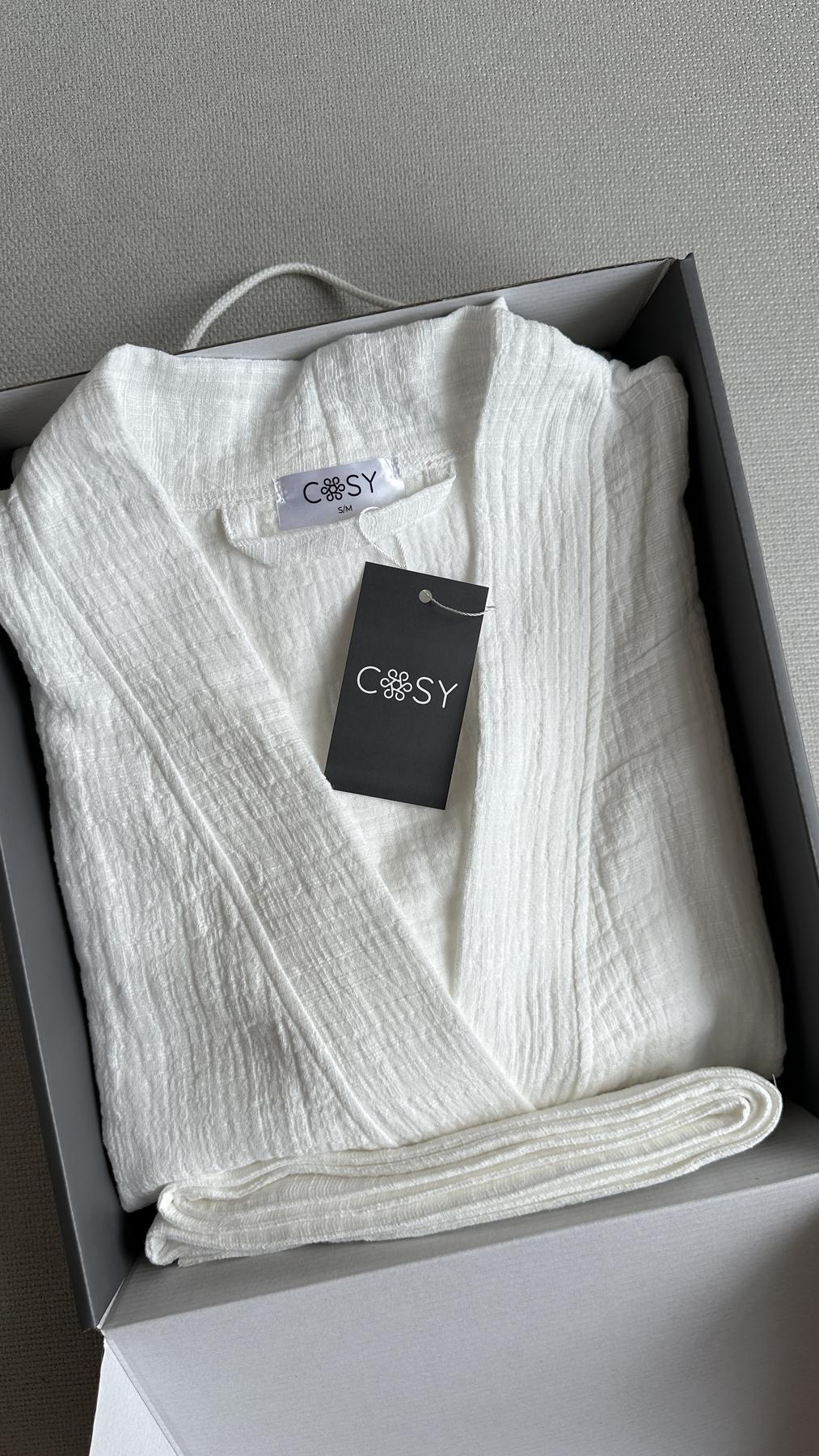 Білий халат-кімоно з фактурного мусліну – чистота стилю та витонченості