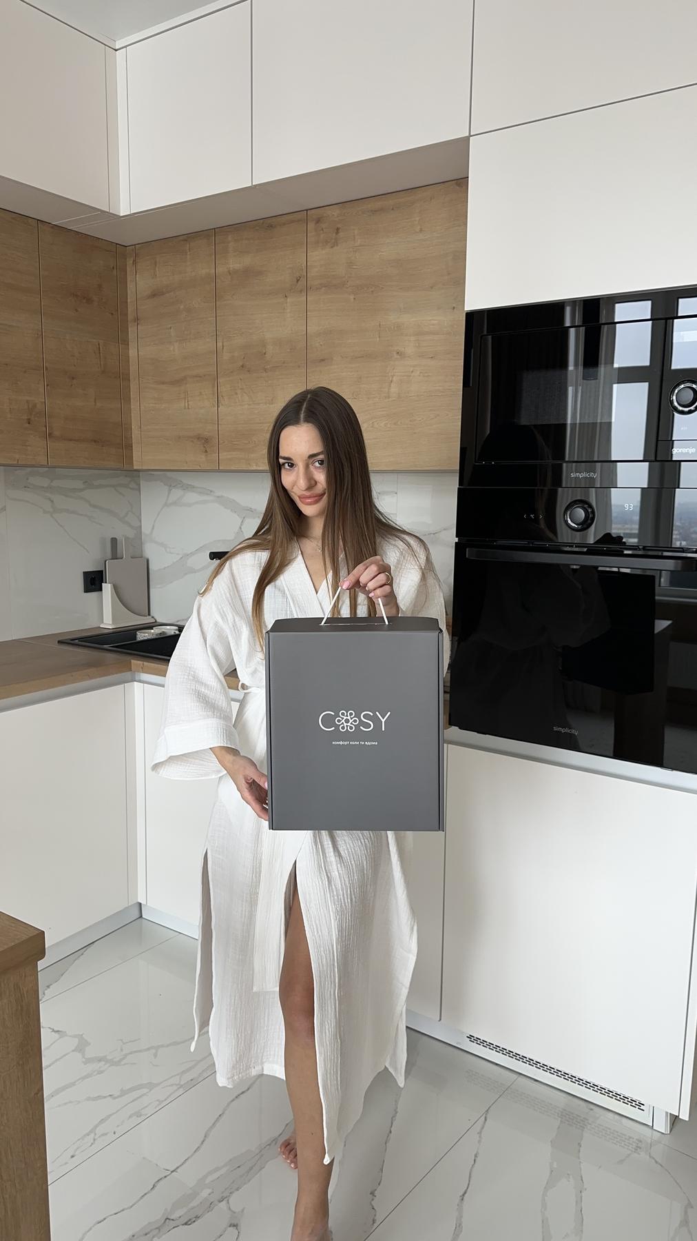 Цей халат – втілення естетики стриманої розкоші. Його білий колір символізує чистоту та легкість, а фактурний муслін із ніжною лляною ноткою додає виробу шляхетного вигляду.