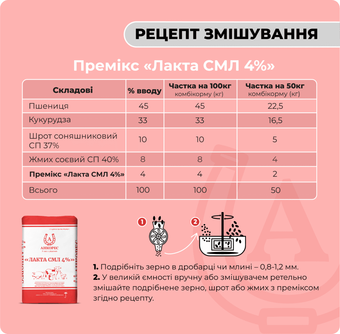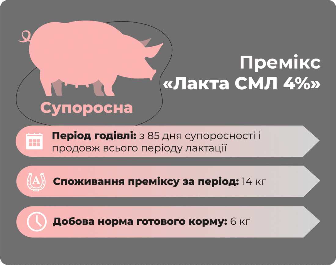 Забезпечте легкі пологи та максимальну молочну продуктивність з Премікс «Лакта СМЛ 4%». Використовуючи Премікс «Лакта СМЛ 4%» організм свиноматки не виснажується і як результат – високий тонус родових шляхів, мінімізація втручання в процес опоросу, матка швидко відновлюється, свиноматка вчасно приходить в охоту та осеміняється. Купити премікс «Лакта СМЛ 4%» від українського виробника «Анкорес» можна в нашому інтернет-магазині. Під час супоросного періоду свиноматки потребують особливого догляду та годівлі, щоб забезпечити нормальний розвиток плодів. Незбалансована годівля або стрес можуть призвести до ускладнень під час опоросу та зниження продуктивності. Здорова годівля лактуючих свиноматок забезпечить високий вміст імуноглобулінів в молоці, що гарантуватиме високий імунітет поросят під час відлучення.