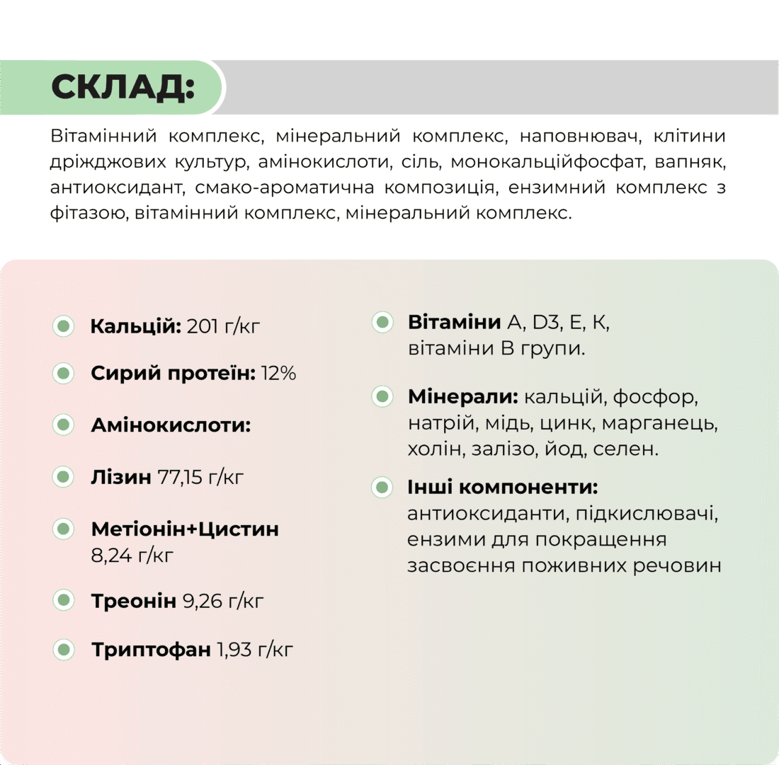 5. Зниження витрат на корм: Завдяки ефективнішому засвоєнню поживних речовин, загальні витрати на корм можуть бути знижені до 30%.