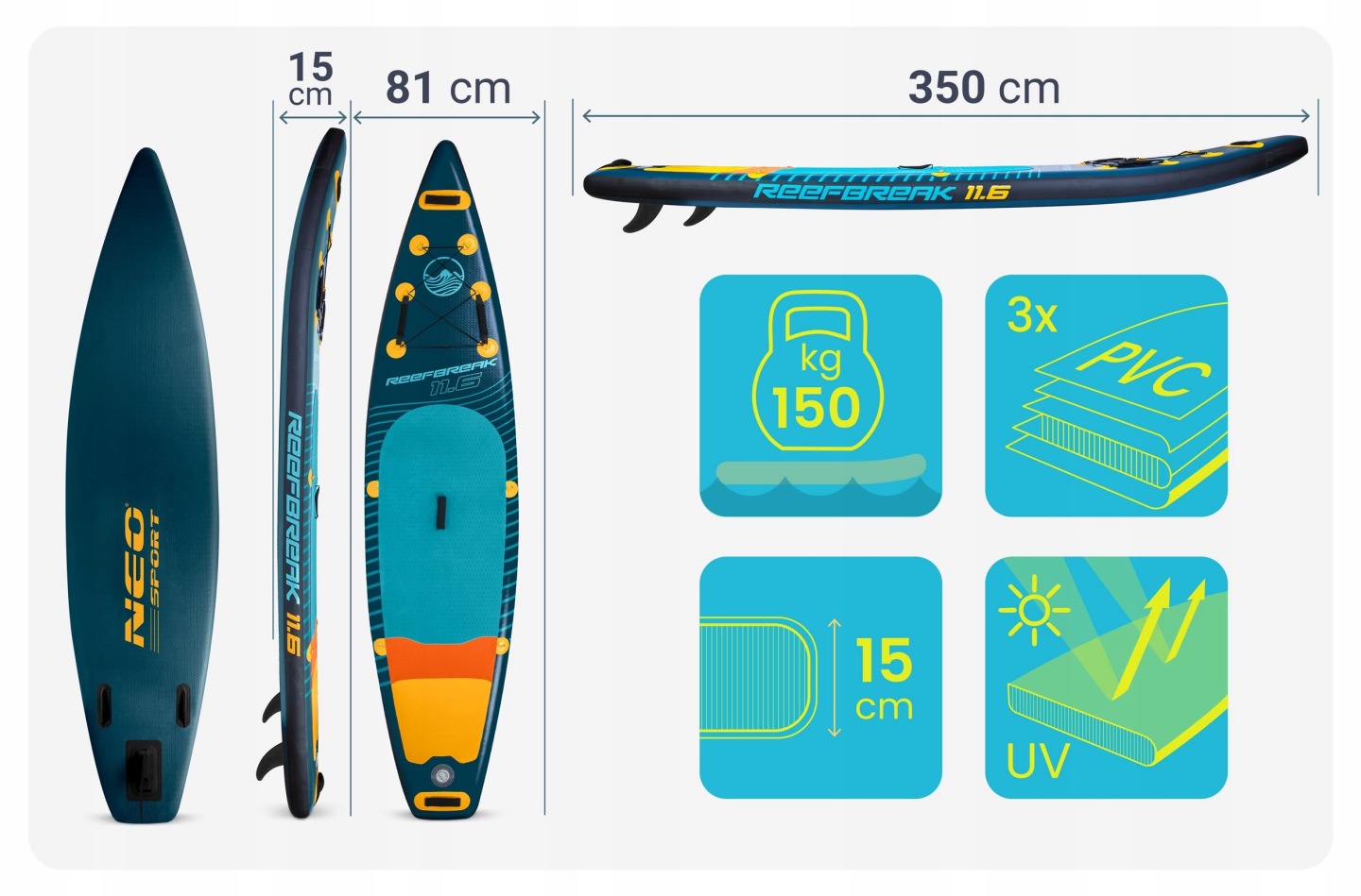 Надувна SUP дошка (Сапборд) Neo-Sport 170311 Reefbreak 350 х 81 х 15 см — це сучасна надувна дошка для веслування стоячи, яка створена для тих, хто прагне швидкості та динаміки на воді. Завдяки своїй довжині 350 см вона забезпечує чудове ковзання та ефективність руху, що особливо оцінять досвідчені райдери. Водночас її ширина 81 см та товщина 15 см гарантують достатню стабільність, щоб комфортно тримати баланс навіть новачкам. Міцні матеріали та технологія Drop Stitch забезпечують високу жорсткість і довговічність у використанні.