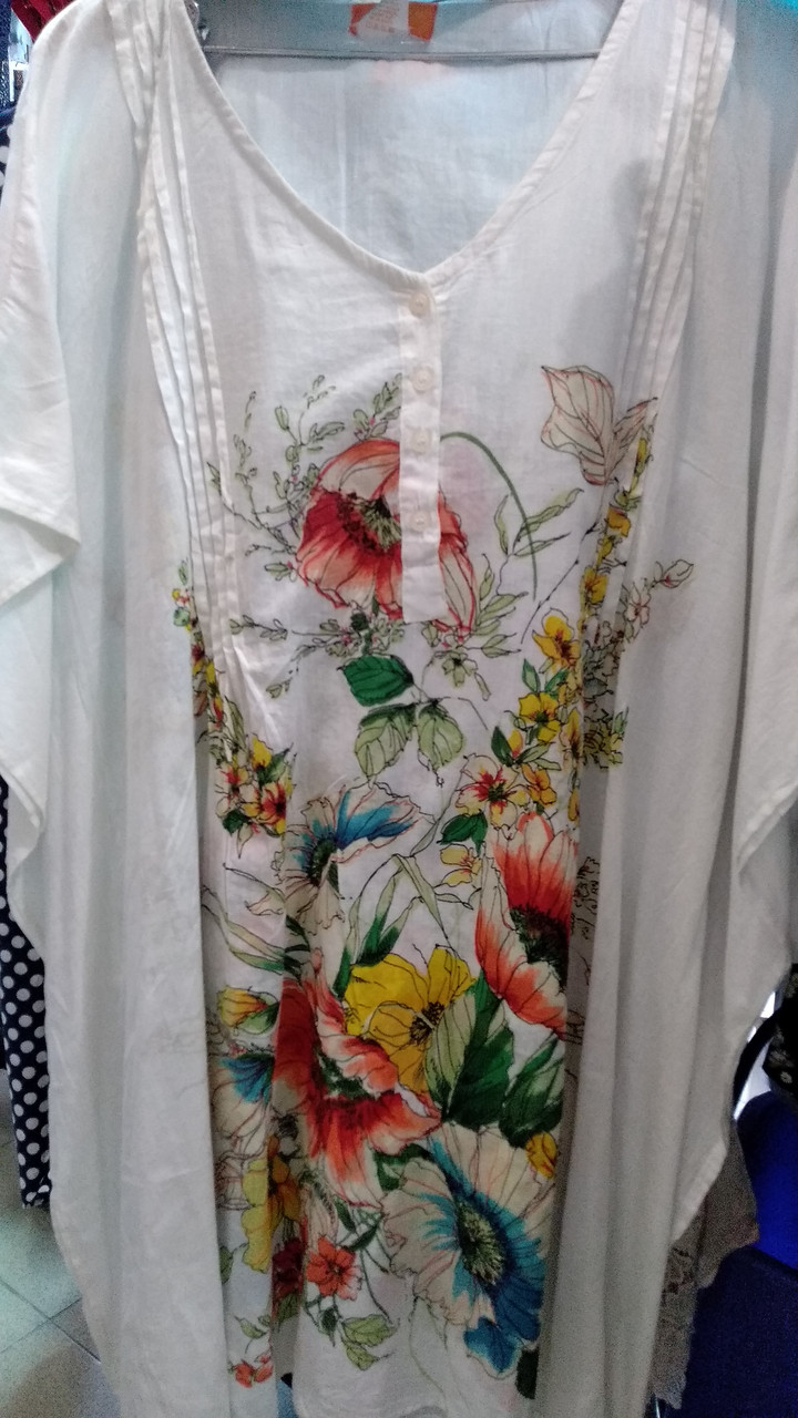 Тунікат  вільного прямого крою без рукавів. Плаття-туніки стають дедалі актуальнішими на морських узбережжях. Оригінальна, дуже легка туніка з квітковим принтом як спереду, так і на спині.   Довжина до рівня колін.  Туніка з м'якого повітряного матеріалу 100% бавовна,  з найтоншого волокна. Розміри М — XXL. Два варіанти кольору білий і блакитний.