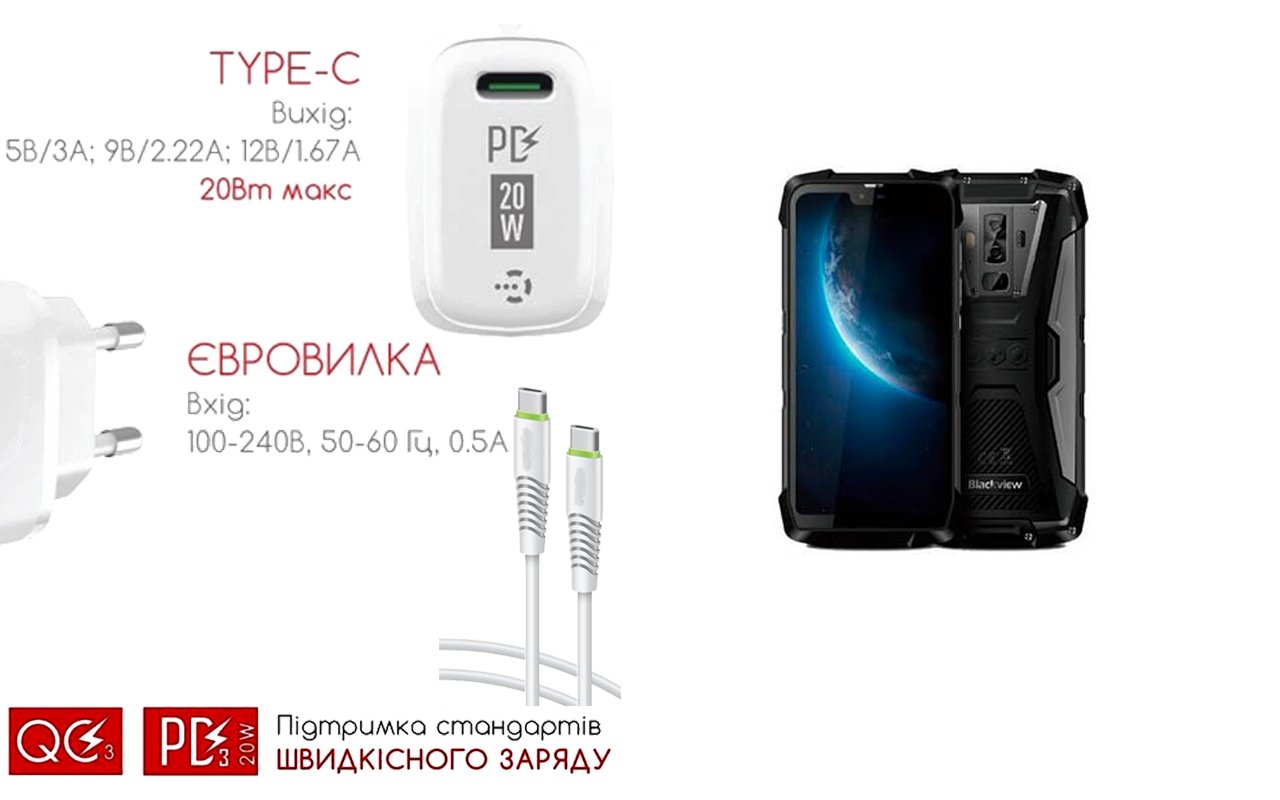 Quick Charger 20W 3A для смартфона Blackview BV9700 Pro, Швидка зарядка