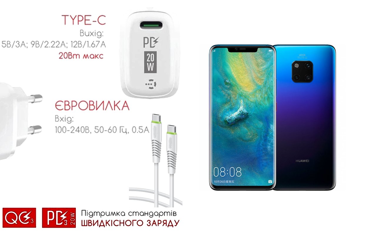 Quick Charger 20W 3A для смартфона HUAWEI Mate 20 Pro, Швидка зарядка