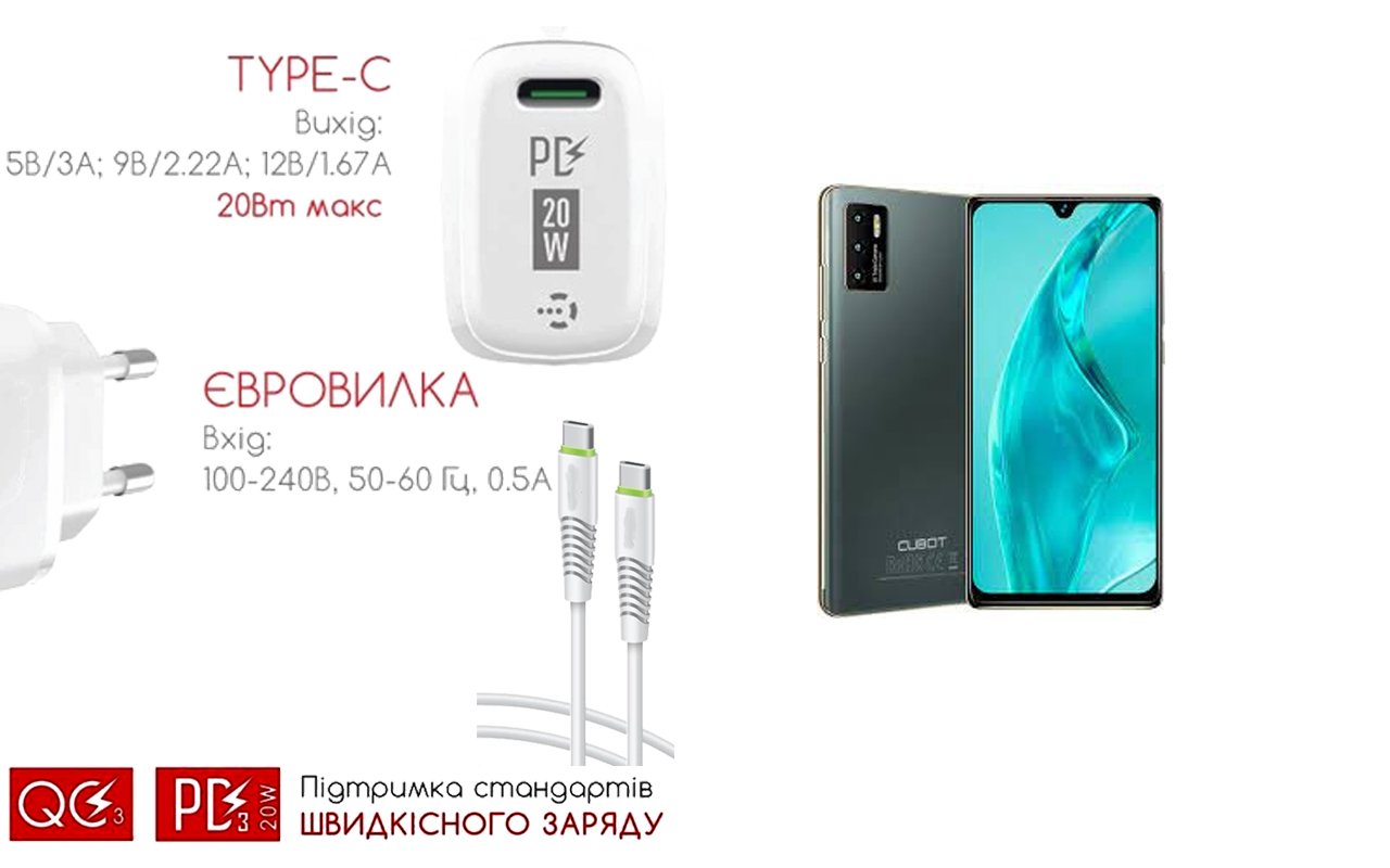 Quick Charger 20W 3A для смартфона Cubot P50, Швидка зарядка