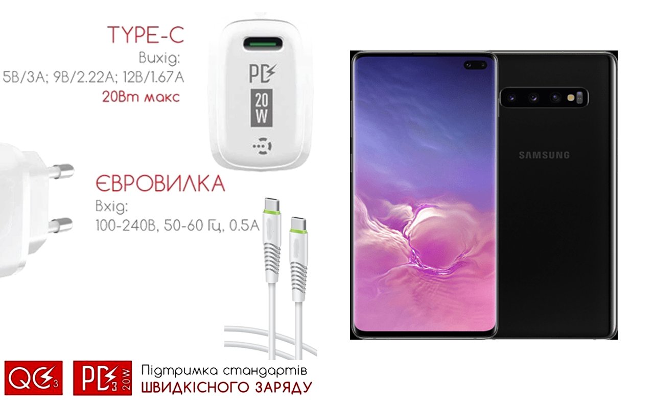 Quick Charger 20W 3A для смартфона Samsung Galaxy S10 Plus, Швидка зарядка