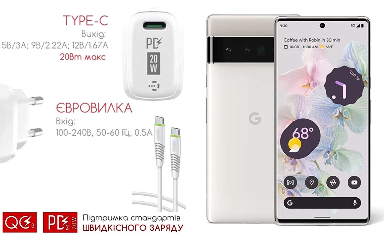 Quick Charger 20W 3A для смартфона Google Pixel 6a, Швидка зарядка