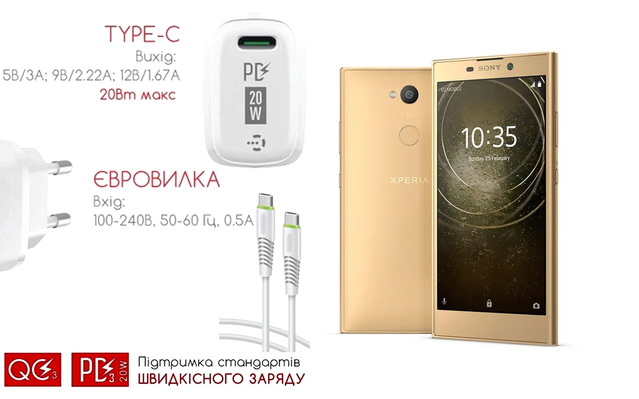 Quick Charger 20W 3A для смартфона Sony Xperia XA2 Ultra H4213, Швидка зарядка
