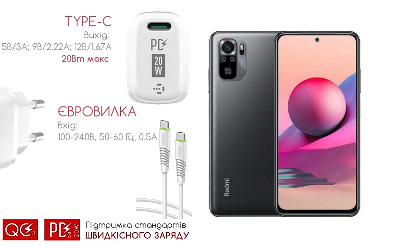 Quick Charger 20W 3A для смартфона Xiaomi Redmi Note 10S, Швидка зарядка