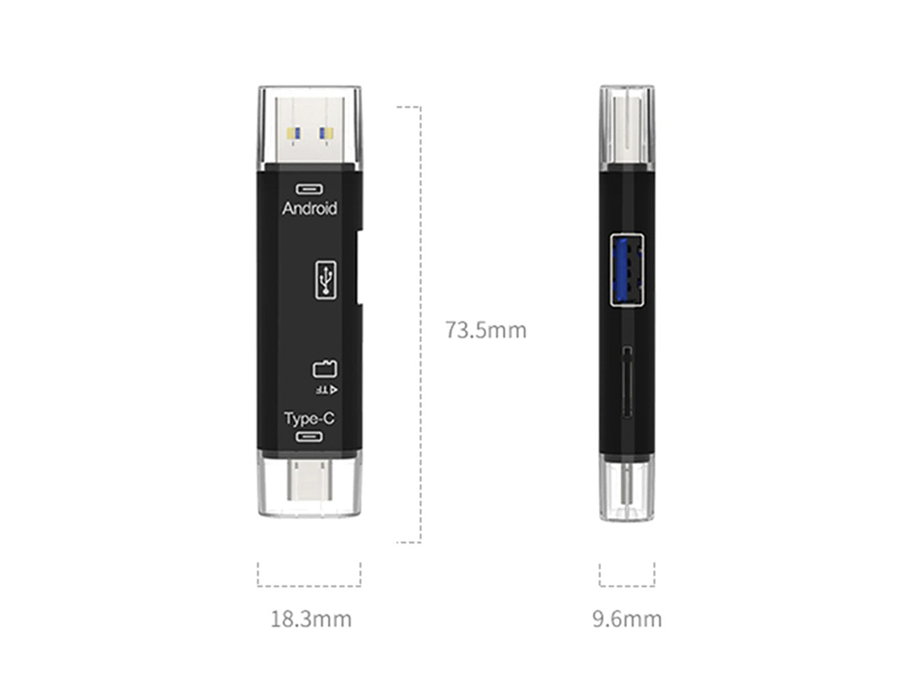 Кард-рідер 5 в 1 Micro USB Type-C USB USB 2.0 MicroSD (TF) - це універсальний кардрідер з безліччю портів: Micro USB Type-C USB USB 2.0 MicroSD (TF). Кардрідер можна використовувати як флешку, якщо вставити TF- карту.