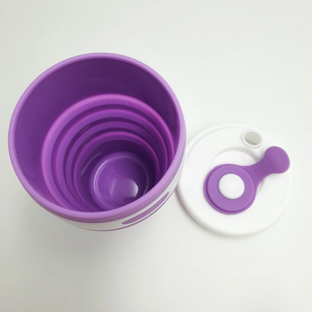 Кришка щільно закриває чашку, забезпечуючи герметичність і утримуючи тривалий час температуру напою. Силіконова чашка  зручно складається, водночас висота в складеному вигляді становить усього 6 см, її можна навіть покласти в кишеню!