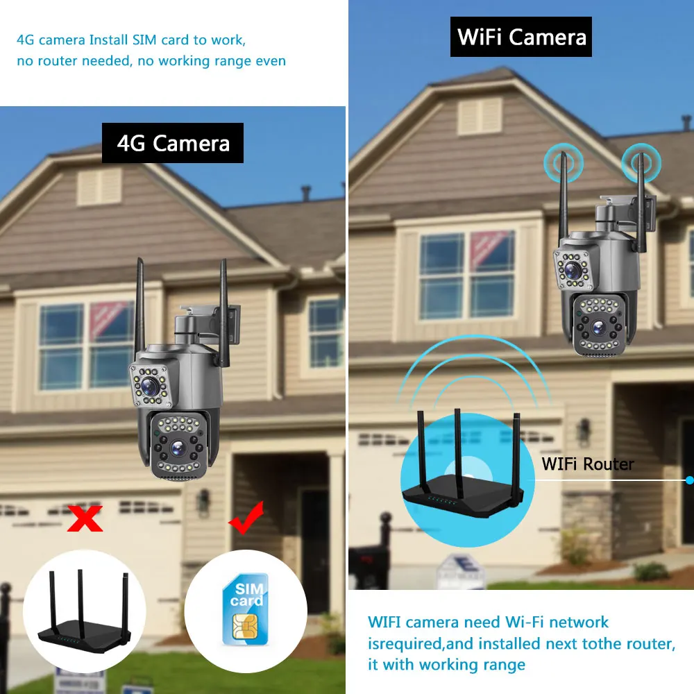 Камера 4G может работать, установив SIM-карту, без маршрутизатора, без рабочего диапазона, может быть установлена в любой среде с сетью 4G. Wi-Fi-камера нуждается в сети Wi-Fi и установлена рядом с маршрутизатором, она работает в диапазоне.