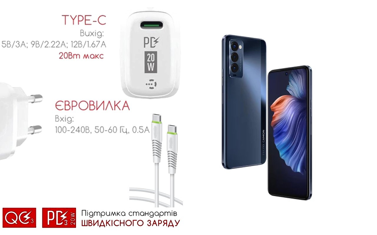 Quick Charger 20W 3A для смартфона Tecno Camon 18 (CH6n), Швидка зарядка