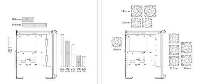 - Спереду: 120 мм x3 / 140 мм x 2 (x3 120-мм вентилятори ARGB передвстановлено)