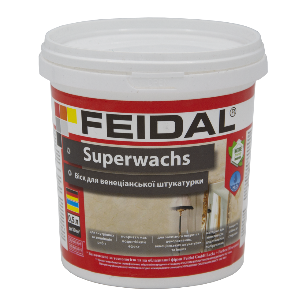 Застосування та характеристика: декоративний віск на основі натуральних природних компонентів, призначений для захисного покриття декоративних штукатурок FEIDAL Venedigputz, FEIDAL Veneciano та інших. Матеріал дає можливість отримати покриття з високим блиском. Колір поверхні стає більш насиченим, яскравим, збільшує відблиск, покриття має водостійкий ефект. Для внутрішніх та зовнішніх робіт. Після нанесення воску FEIDAL Superwachs можливе насичення кольору поверхні на один тон.