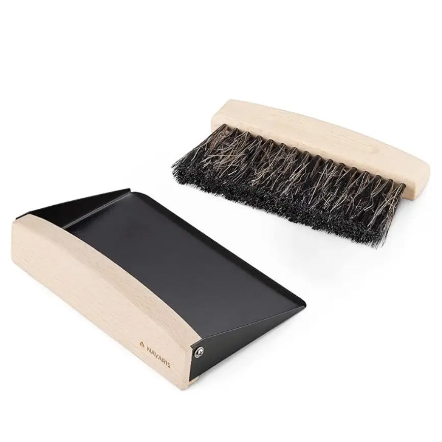 Цей набір оснащений магнітом на ручці, що дозволяє легко тримати щітку в совку, забезпечуючи зручне зберігання і швидкий доступ до них. Металевий лоток з покриттям гладкий на дотик і має рівний край, що дозволяє ефективно збирати сміття без пошкоджень столу. Натуральна щетина з кінського волосу та ручки з букового дерева надають цим інструментам стильний вигляд і додаткову міцність
