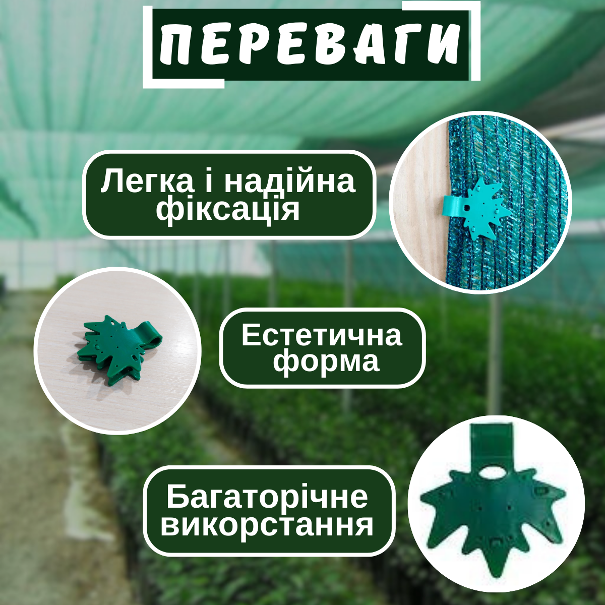 Кліпси для кріплення затіняючої сітки "Листок" ідеально підійдуть для садівників та фермерів, які шукають надійний спосіб закріпити сітки на своїх ділянках, вирішують проблему ненадійного кріплення завдяки спеціальним вусикам, що легко проникають у сітку будь-якої щільності.Простота у використанні та можливість багаторазового застосування роблять ці кліпси незамінними для швидкого встановлення та фіксації сітки за допомогою мотузки або шпагату, забезпечуючи захист від розпускання та розриву.
