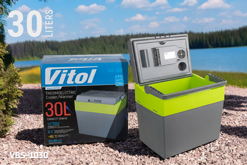 THERMOMIX VBS-1030 — ТЕРМОЕЛЕКТРИЧНИЙ ХОЛОДИЛЬНИК 30 Л Практичний автомобільний холодильник для подорожей, відпочинку на природі, пікніків і тривалих поїздок. Завдяки об’єму 30 літрів підходить для зберігання напоїв, готових страв і продуктів у дорозі.