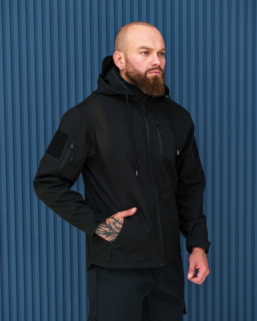 Куртка Softshell преміум з мікрофлісом чорна для демісезону Капюшон липучки багато кишень Легка вод VE-33