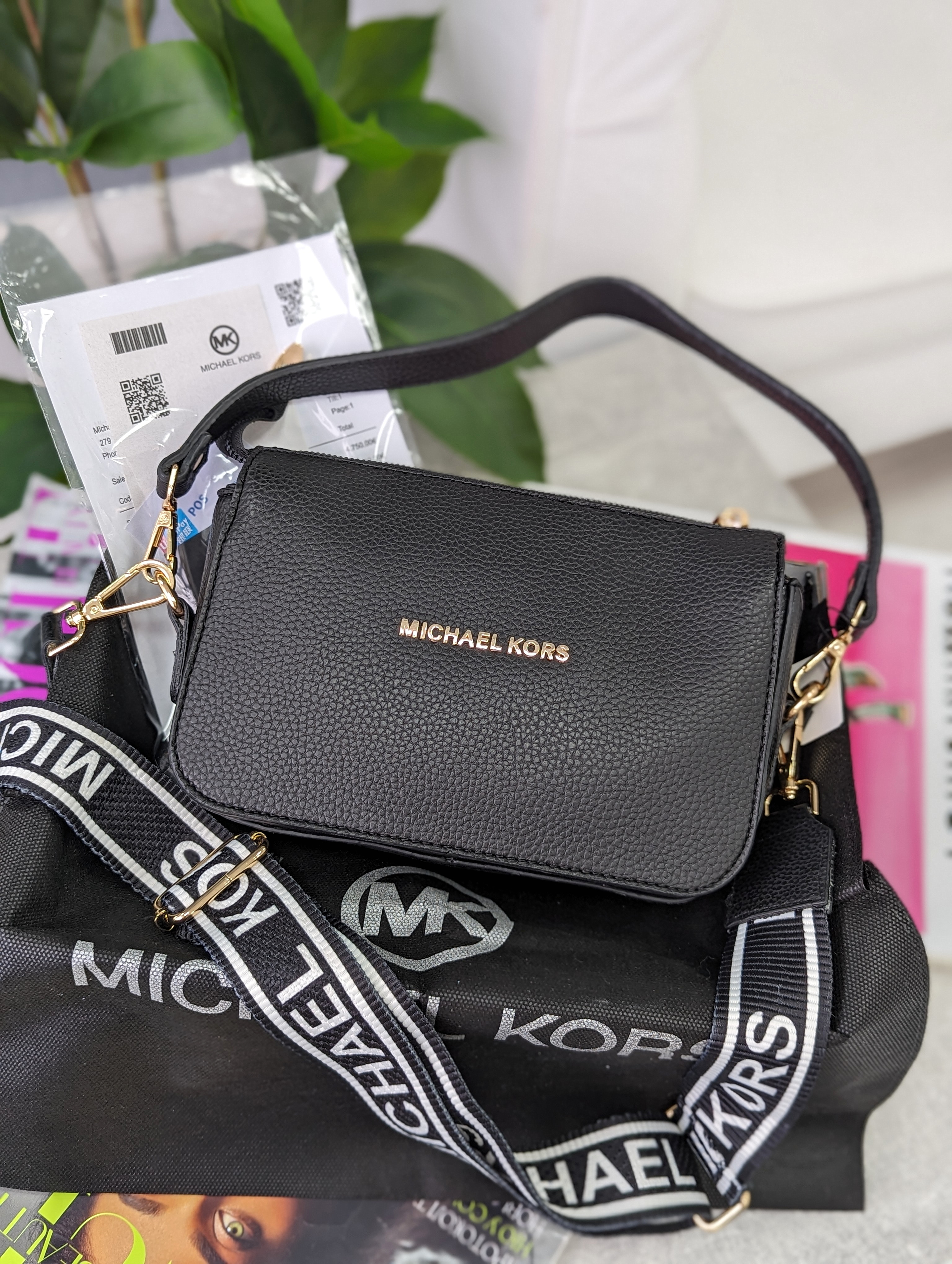 Сумка кросс-боді майкл корс брендова жіноча чорна шкіряна з логотипом та широким ременем Michael Kors