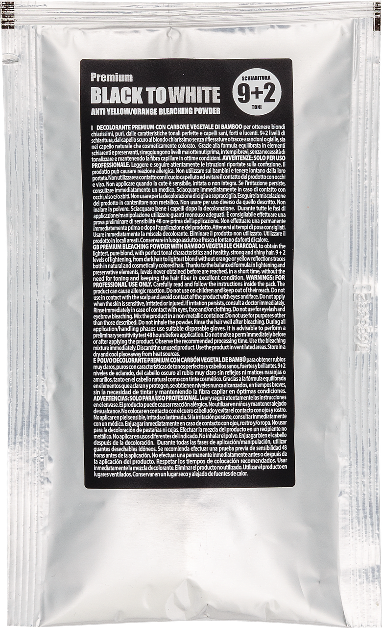 Знебарвлювальна пудра BLACK TO WHITE 9+2 з рослинним бамбуковим вугіллям. Дає змогу отримати найсвітліший чистий блонд і залишає волосся здоровим, сильним і блискучим. Забезпечує недоступні раніше рівні освітлення з максимальним захистом волосся й нейтралізацією небажаних жовтих/жовтих відтінків.