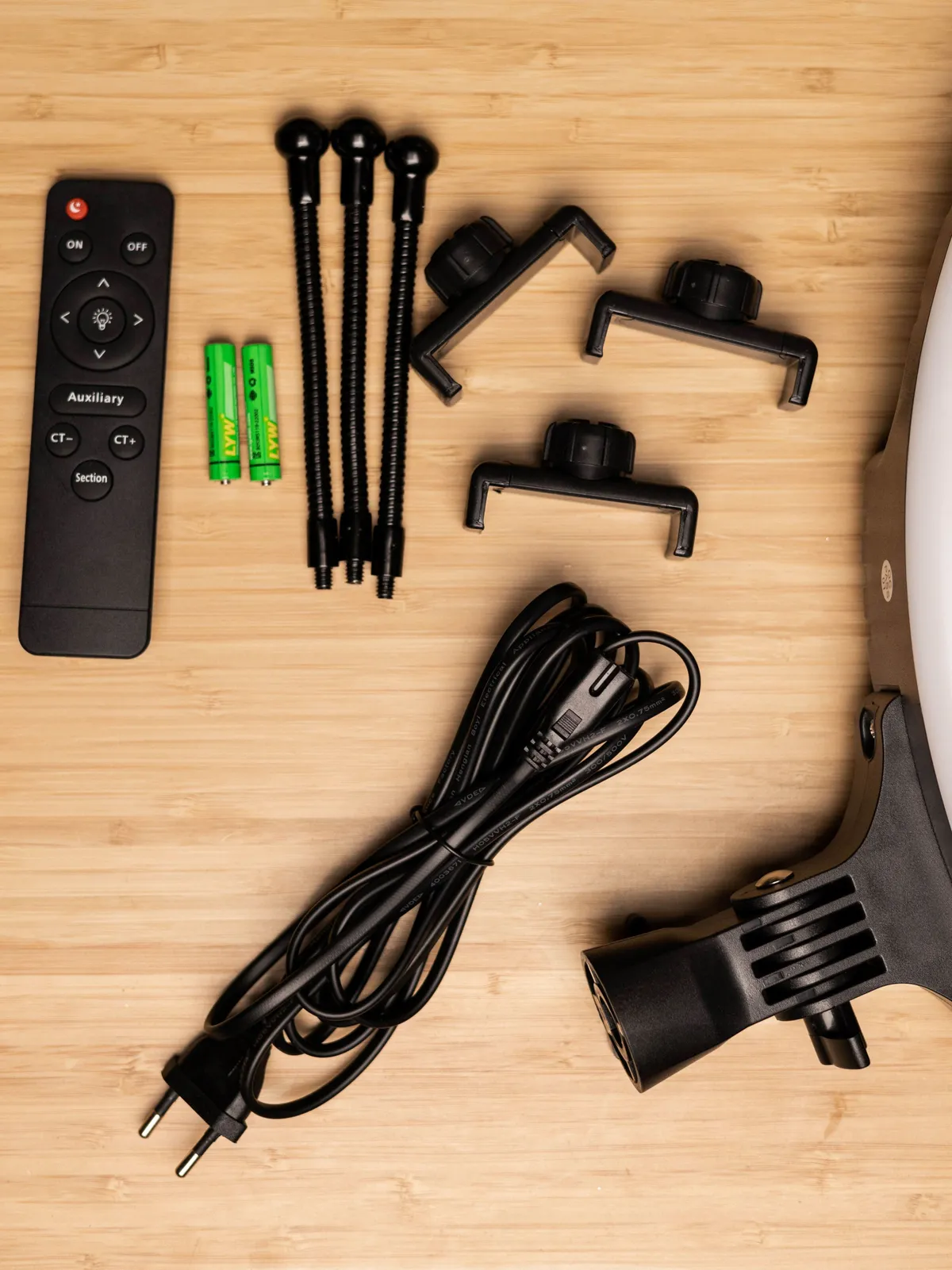 Кільцева лампа — 45 см. Штатив посилений — 2 метри. Тримач телефона — 3 шт. Пульт ДК. Сумка - переноска. Мережевий кабель — 3 метри
