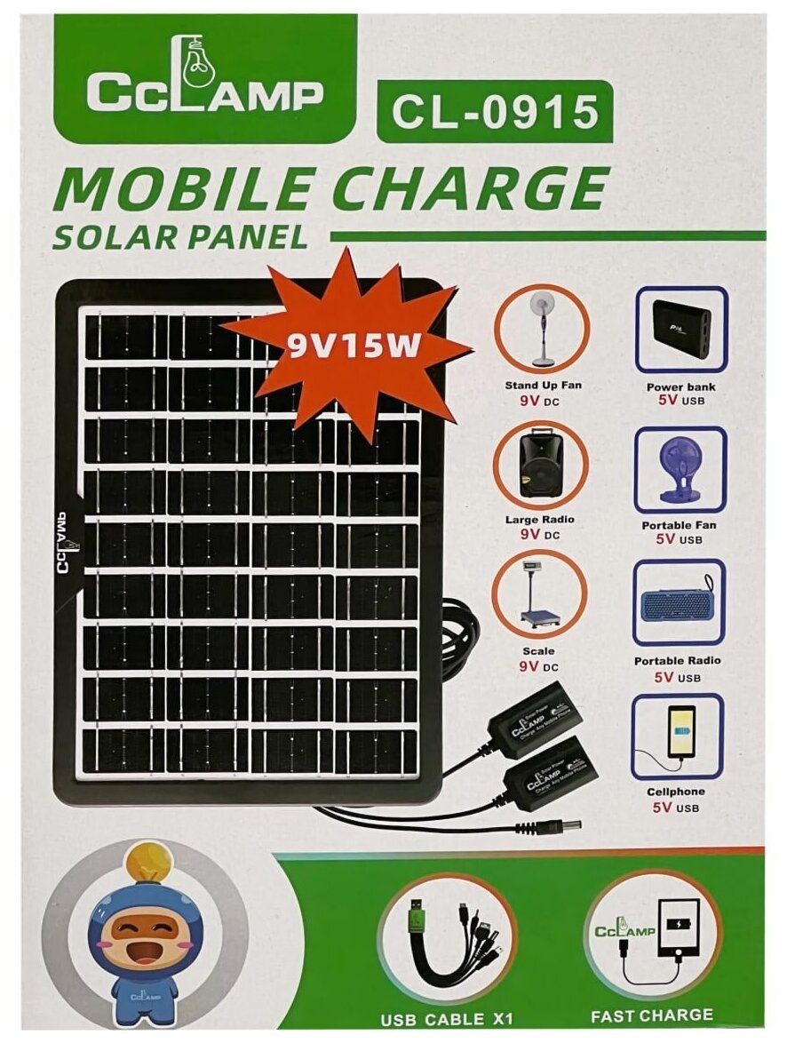 Вологозахищена сонячна панель CCLAMP CL-0915 потужністю 15W. Корпус панелі виконаний з пластику і має ніжку для монтажу панелі під необхідним кутом до сонячних променів.