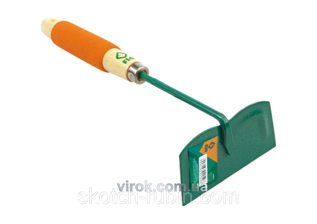 Сталева мотика з робочою шириною 110 мм. Встановлена на короткій ручці з дерев'яним держаком.