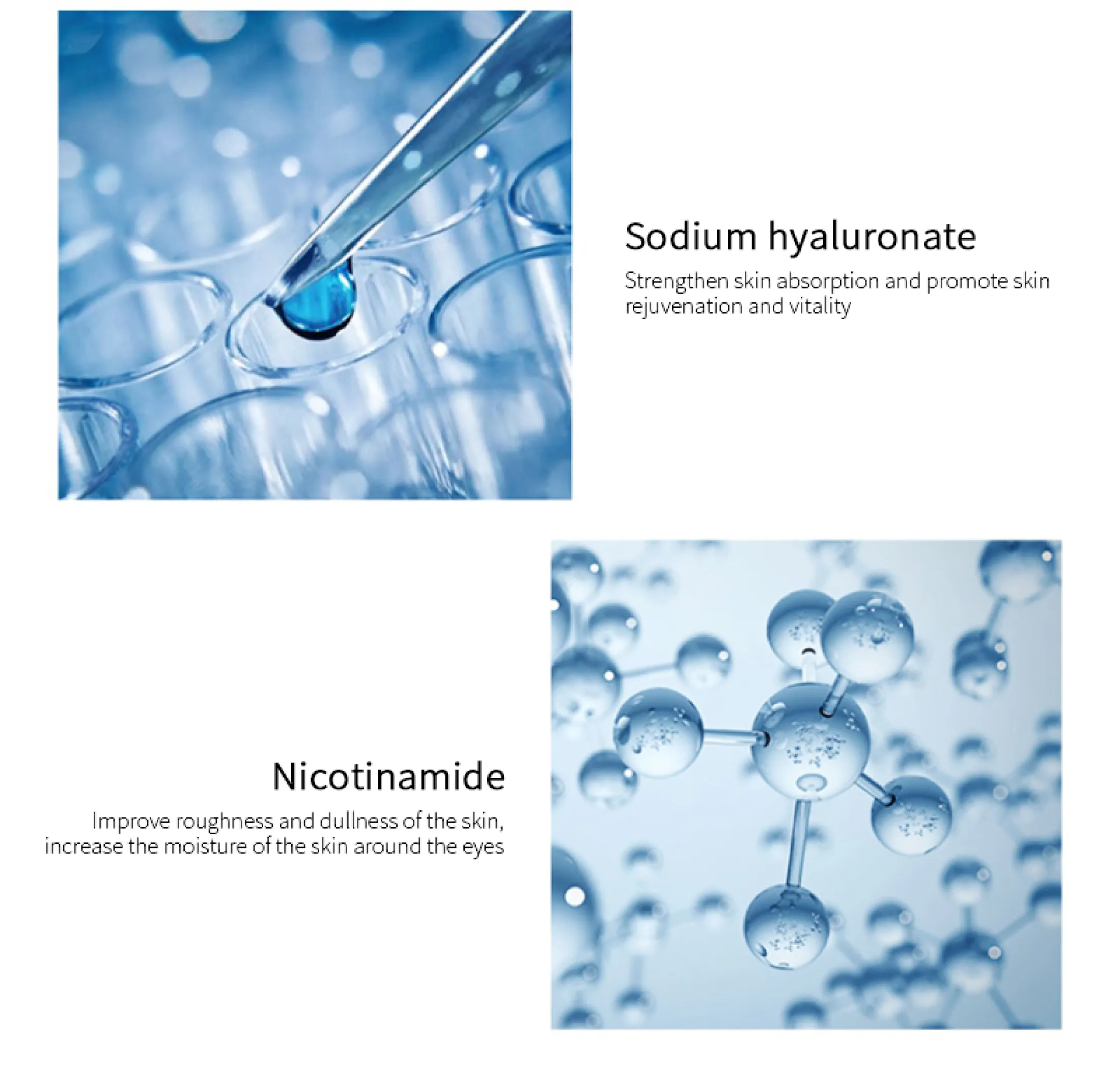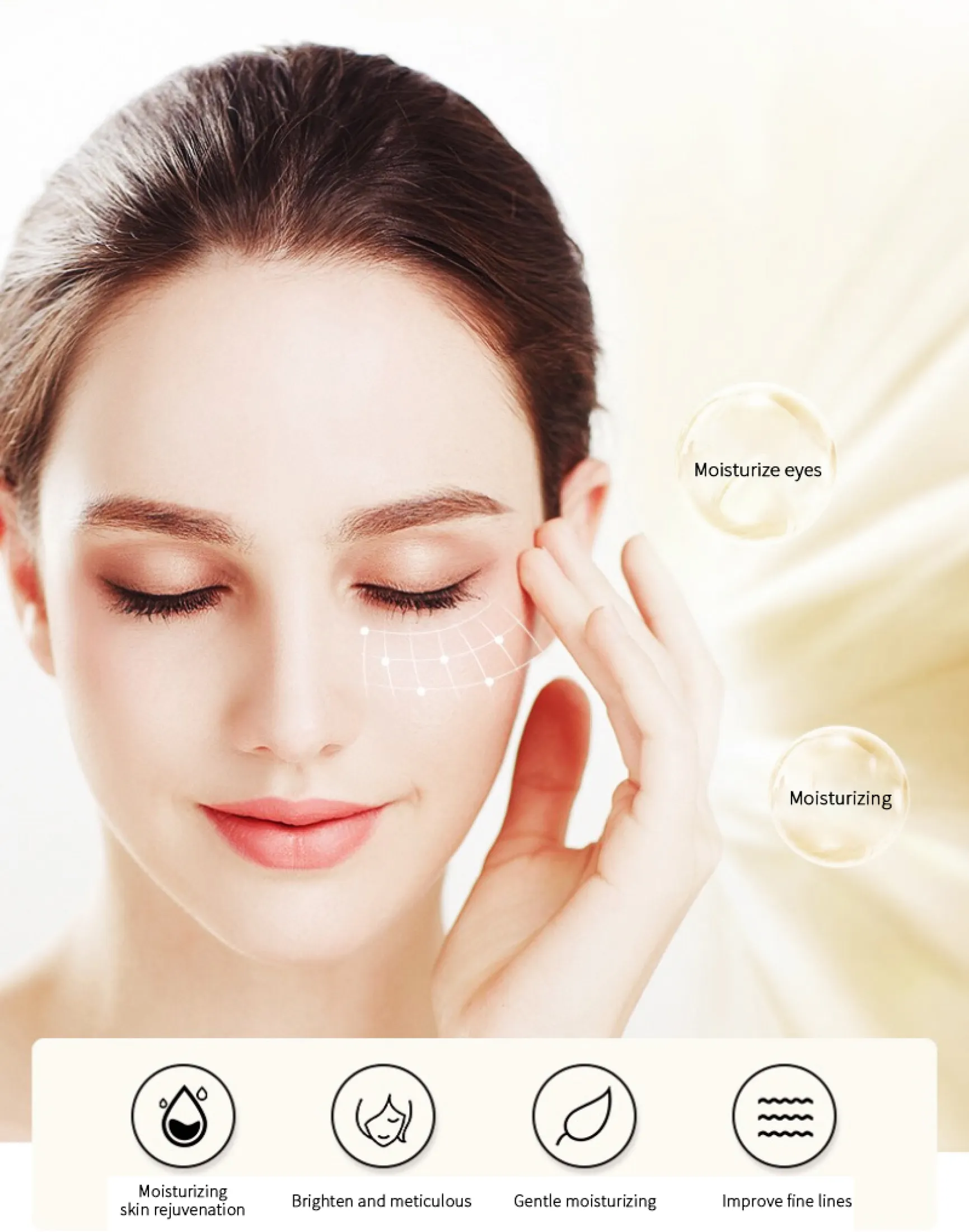 - Ацетилоктапептид-3 — впливає на механізм скорочення мімічних м'язів, розслабляючи їх і розгладжуючи зморшки в зоні навколо очей.