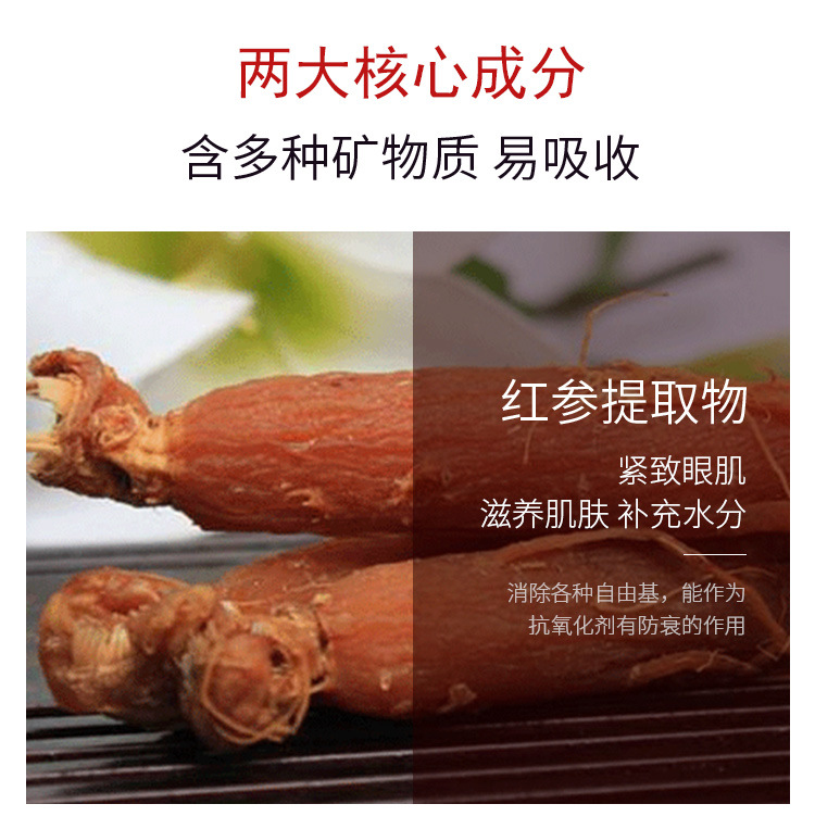 • Екстракт червоного женьшеню — інтенсивно живить, сприяє відновленню шкіри, захисту від зневоднення та посиленню мікроциркуляції крові. Крім цього, він тонізує, стимулює регенерацію, зміцнює епідермальний матрикс, делікатно вибілює й освітлює пігментацію, уповільнює процеси старіння шкіри.