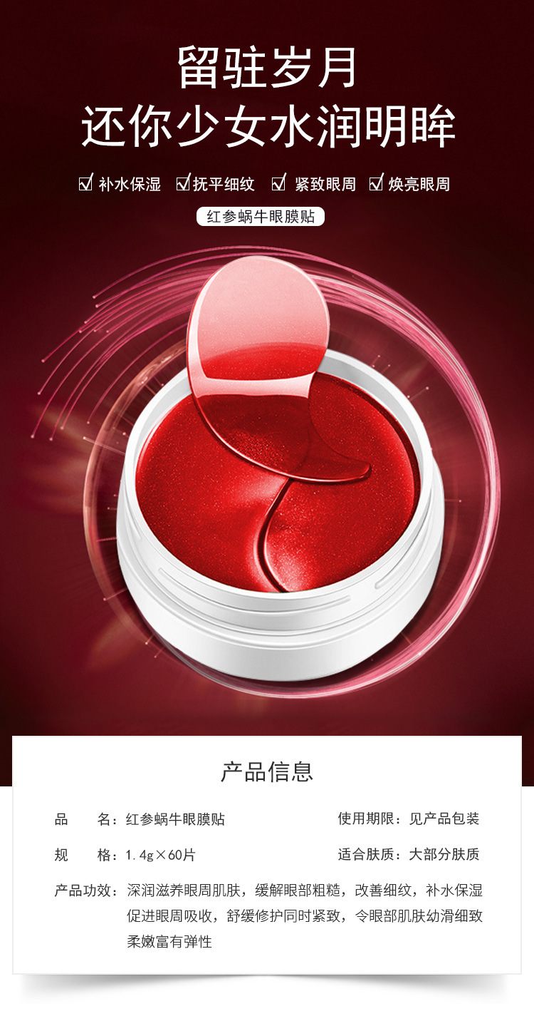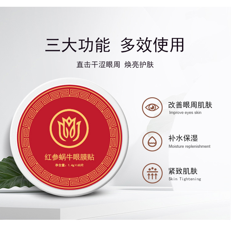 Гідрогелеві патчі під очі з фільтратом слизу равлика та женьшенем Red Ginseng Snail Eye Mask подарують вашій шкірі справжній професійний догляд: засіб ефективно згладжує зморшки та забезпечує максимальне живлення клітин дерми. Формула з колагеном усуває зневоднення, загоює мікротріщини та знімає запалення, забезпечує ліфтинг-ефект. Завдяки щільній текстурі патчів активні компоненти основи проникають вглиб епідермісу, посилено насичують клітини шкіри амінокислотами та вітамінами. Засіб усуває темні круги та набряки, зволожує й пом'якшує; зменшує вираженість мішків під очима, забезпечує посилену мікроциркуляцію крові та її приплив до клітин дерми.