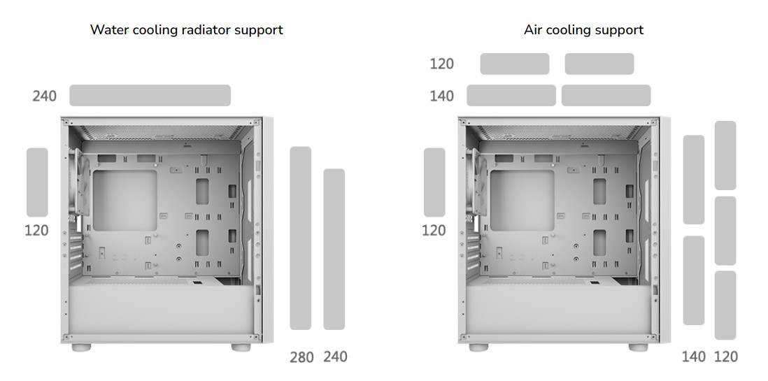 - Зверху: 240 мм/120 мм (при встановленні верхнього радіатора обмеження висоти RAM становить 45 мм)