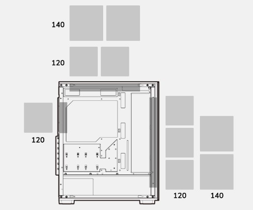 - Спереду: 360 мм / 280 мм / 240 мм / 140 мм / 120 мм (радіатор можна встановити або тільки спереду, або тільки зверху)