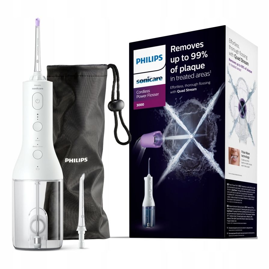 Революція в користуванні зубною ниткою завдяки технології QuadStream. Легке, ретельне очищення між зубами покращує здоров’я ясен. Унікальний наконечник QuadStream легко очищає більшу площу поверхні для більш ефективного використання зубної нитки кожного разу.