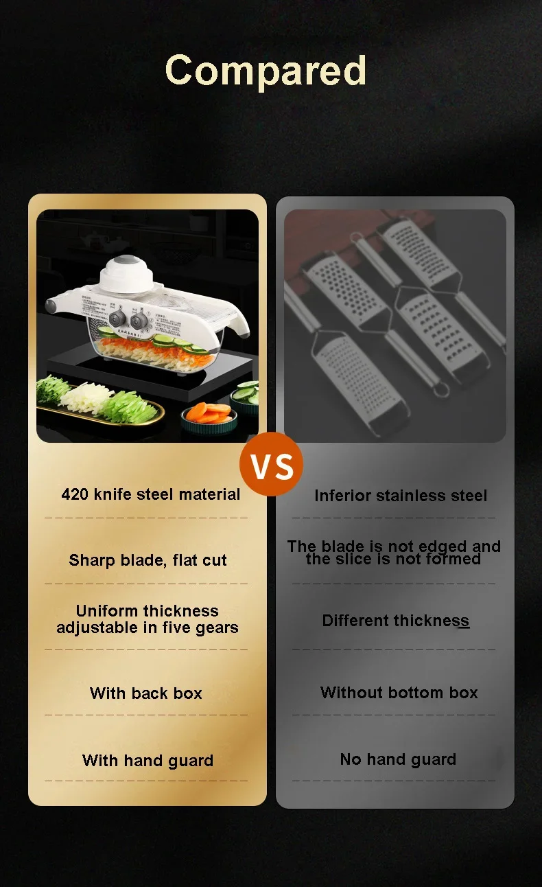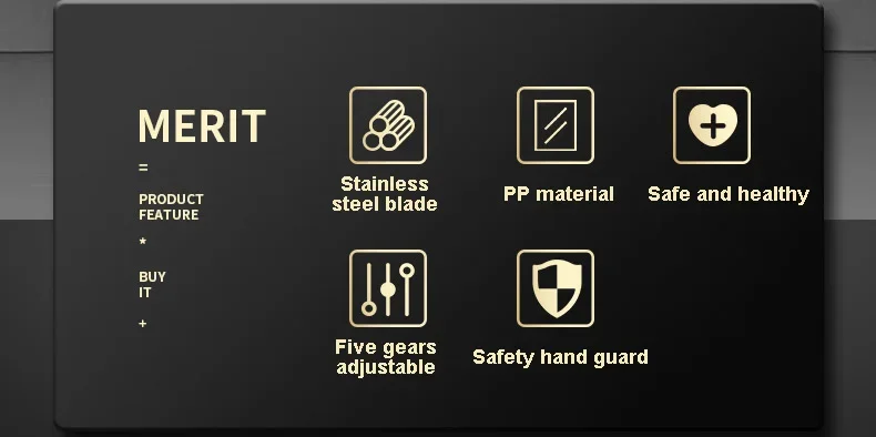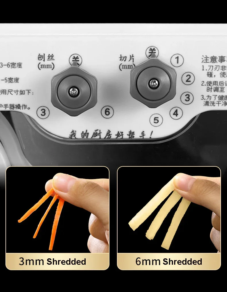 На відміну від традиційних ручних слайсерів, ця швидка слайсерка має 5 регульованих передач, тому ви можете вибрати товщину скибочки відповідно до ваших потреб, щоб задовольнити різні потреби. І товщина скибочки рівномірна. Дозволяючи легко поліпшити якість, він також може подрібнювати, просто обертайте лезо, щоб подрібнити овочі, як-от картопля, морква, огірки тощо. Д. Шестерню можна вибрати з 3 мм або 6 мм.
