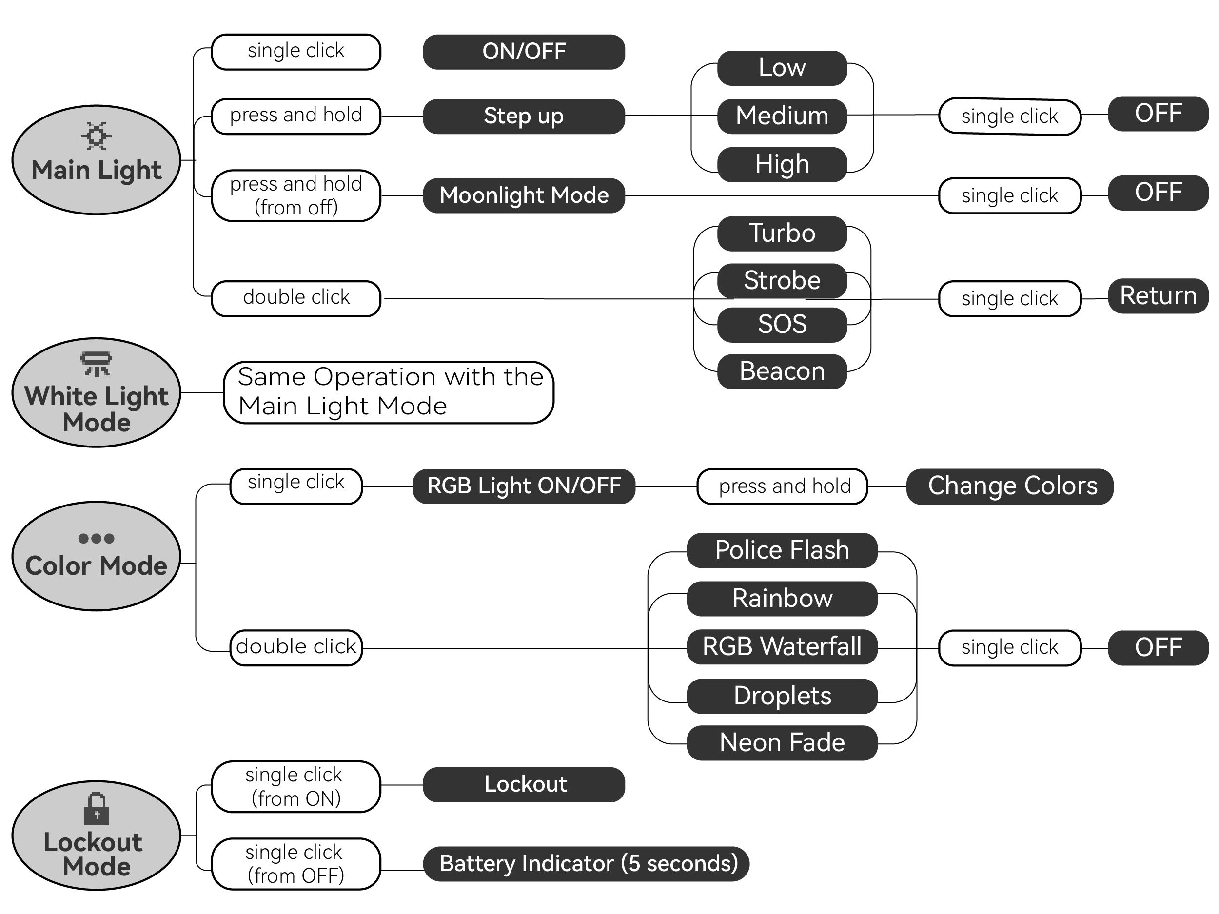 - Прямий доступ до режиму місячного світла: При вимкненому ліхтарику, довге натискання на перемикач для активації режиму місячного світла. Одне натискання для вимкнення.