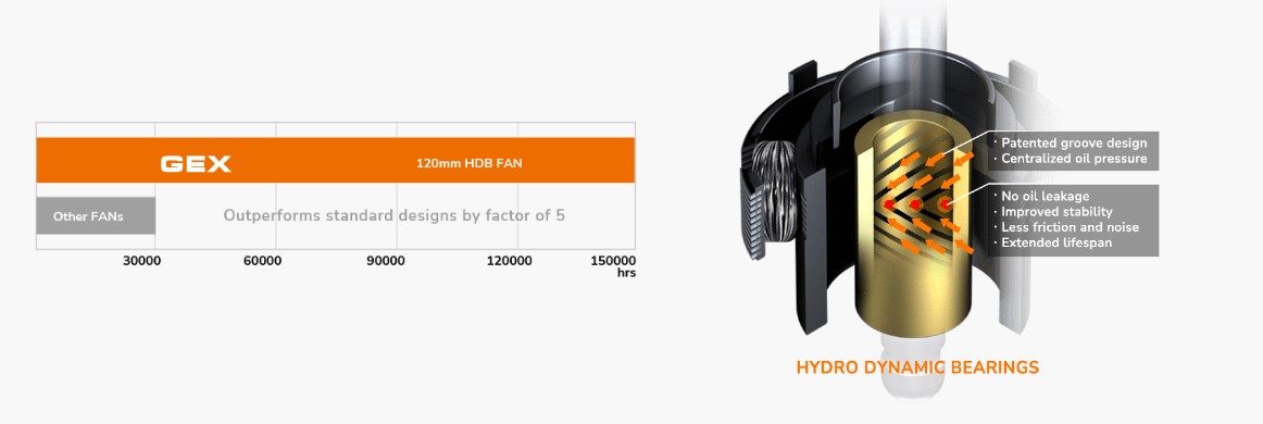 Порівняно з іншими типами вентиляторів, вентилятор з HDB-підшипниками вважається найкращим у своєму класі за рівнем шуму під час роботи та очікуваного терміну служби. Гідродинаміка значно знижує тертя та вібрацію, що призводить до підвищення надійності та тихішої роботи.